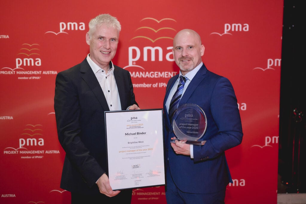 wurde zum Project Manager of the Year ist Michael Binder von Siemens Mobility für Brightline West. Diese Hochgeschwindigkeitsbahnstrecke wird Las Vegas und Los Angeles unter zwei Stunden Fahrzeit verbinden. pma Vorstand Günther Lauer gratuliert. © pma/Martin Hörmandinger