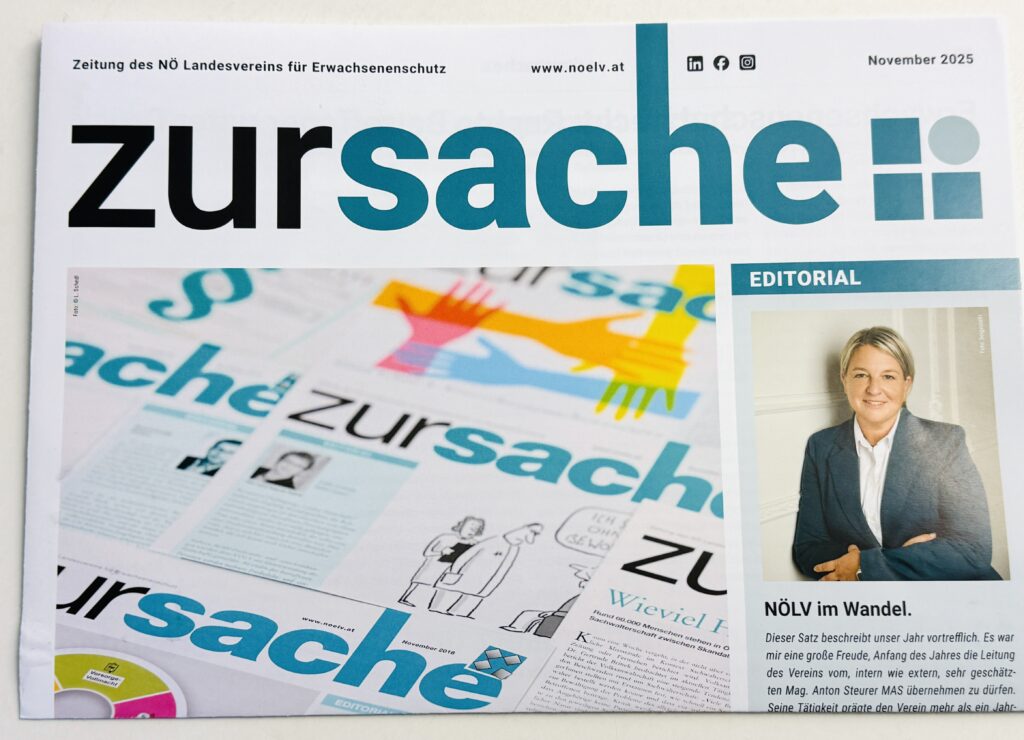 Auch in der Kommunikation werden neue Wege beschritten. Wer wissen will, wie Erwachsenenschutz gelebt wird, kann dem NÖLV Online und in den sozialen Medien folgen. Damit die Themen des Erwachenenschutzes dort ankommen, wo sie hingehören: mitten in die Gesellschaft. Mit Jänner 2025 übernahm Mag.a Delia Jagersberger die Geschäftsführung. Hier lesen Sie die aktuelle zursache.